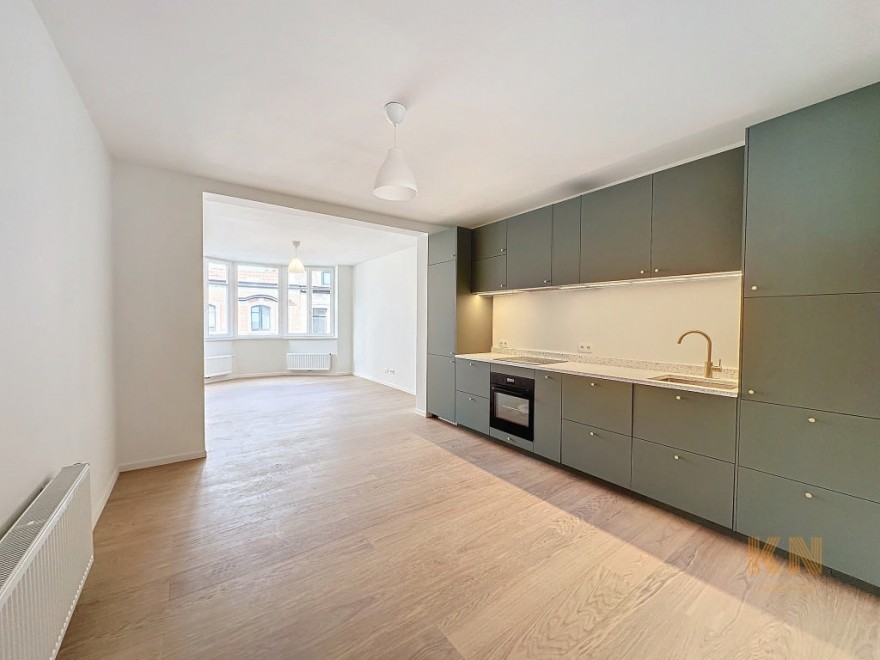 Superbe appartement NEUF après rénovation complète de l'immeuble, il est situé au 2ème étage sur 2 et offre une surface habitable de +/- 70 m². Il dessert un bel espace séjour, un espace bureau ou seconde chambre de +/- 8 m², une cuisine super équipée. Le hall de nuit dessert une chambre à coucher de +/- 13.5 m² et une salle de bains. PEB G (avant rénovation, en attente nouveau PEB). Coup de coeur assuré !! info et contact www.knproperties.be - 0032 485 876 577