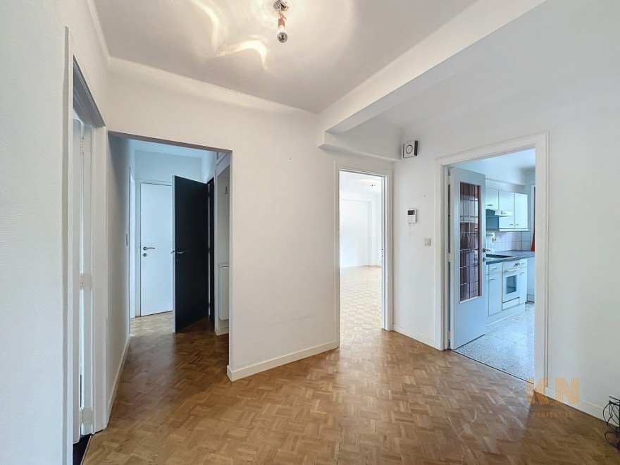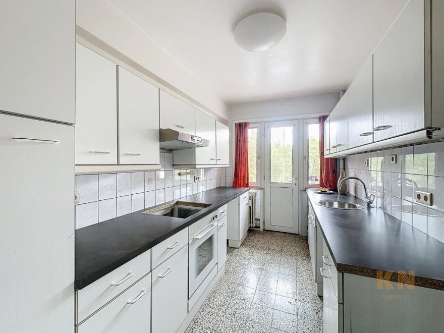 VENDU EN 24 H Superbe appartement de +/- 90 m² dans un immeuble de 1975 (tout beton) situé à Proximité du Prince de Liège/Mettewie dans un immeuble en parfait état. Il dessert un hall d'entrée avec vestiaire et toilette invités, bel espace séjour, une cuisine équipée, un balcon avant. Le hall de nuit dessert 2 chambres à coucher de +/- 13.5 m², une salle de douche. L'appartement dispose d'une possibilité de garage box + un emplacement de parking devant au prix de 50.000 euro, double vitrage, porte blindé, ascenseur aux normes, coup de cur assuré !! info et contact www.knproperties.be - 0032 485 876 577